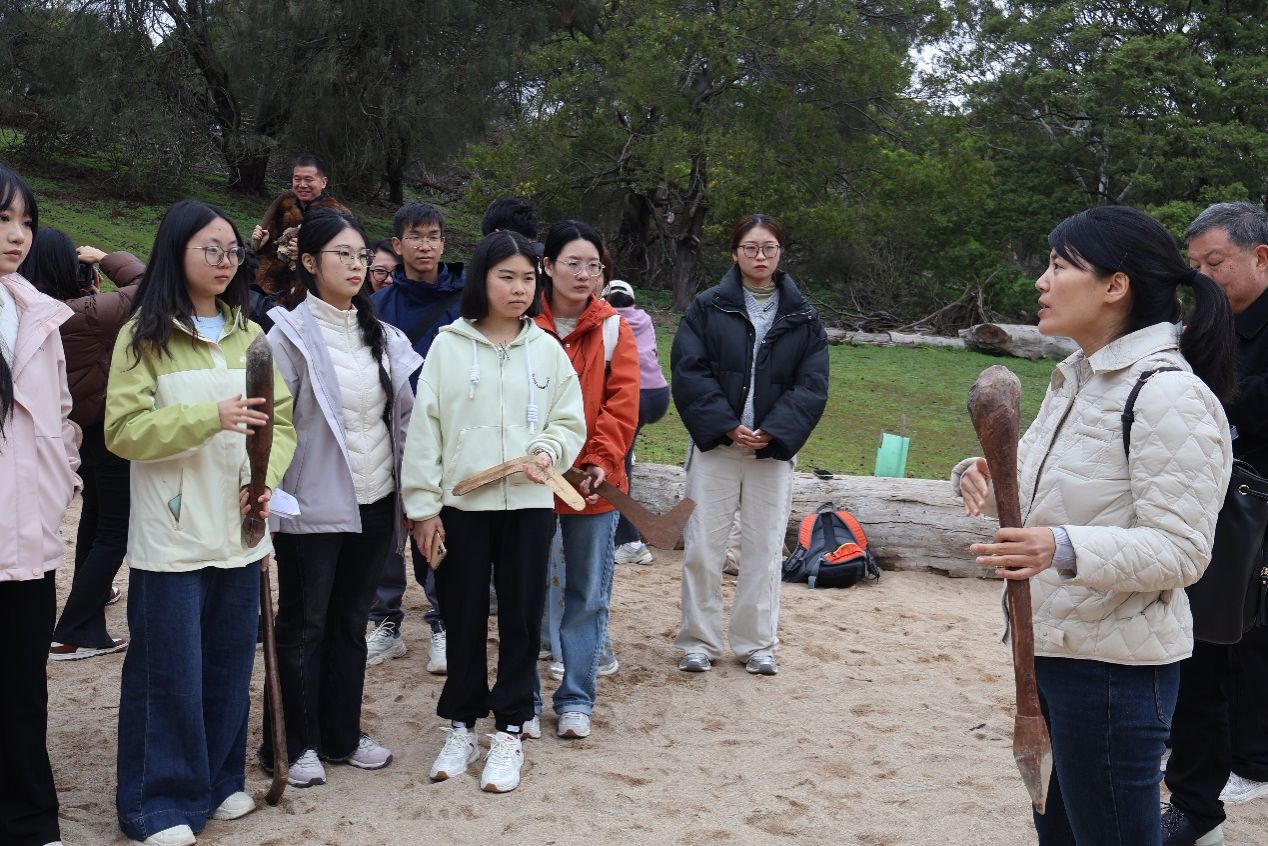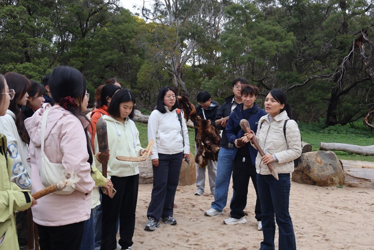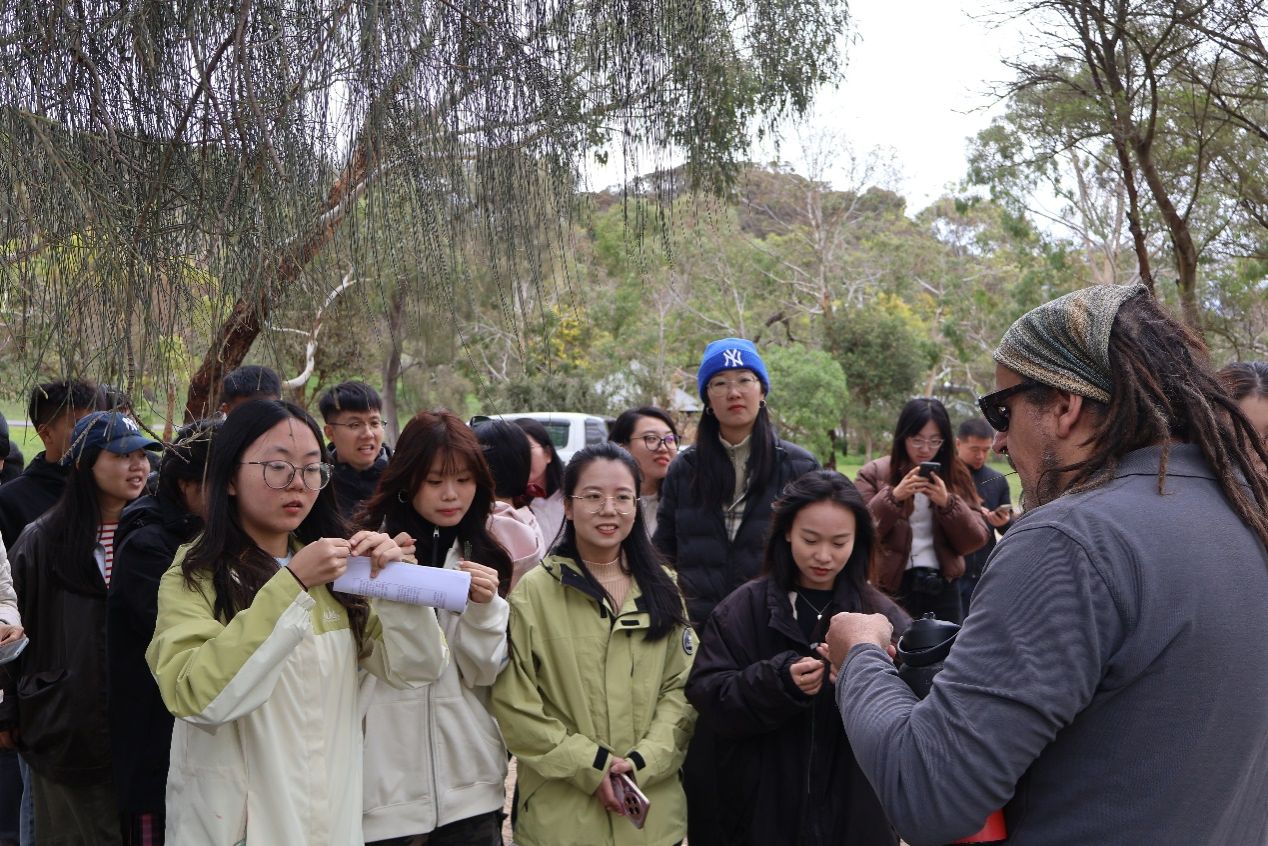 随后,实习队前往塔山野生动物保护区(Tower Hill Wildlife Reserve)——一座位于古老火山口的自然保护地。抵达后,带队老师朱文博首先现场开展了土壤地理学的实地教学,引导员工亲手触摸感知土壤特性,深化大家对当地成土过程与地理环境的理解。活动过程中,员工们不仅近距离观察了考拉、鸸鹋等澳大利亚标志性动物,还积极参与原住民文化体验环节。在原住民向导和带队老师的带领下,大家通过聆听传统故事、认识植物用途、观摩狩猎工具演示,从第一视角深入理解了原住民与自然共生的人文传统和生态智慧。最后,带队老师张丽君以当日所见为例,对人地关系理念进行了系统总结与讲解,进一步提升了队员们对人文地理学的现实认知。
