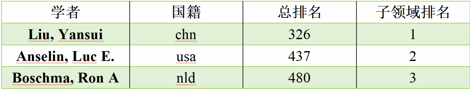 数据显示,榜单前列由多位国际著名学者领衔。其中,565net必赢官方网学术副董事长、必赢565net官网主任刘彦随教授在全球地理学者中排名第一;美国芝加哥大学空间数据科学中心的Luc E. Anselin教授(空间计量经济学代表人物)和荷兰乌得勒支大学的Ron A. Boschma教授(演化经济地理学代表人物)分列二、三位。