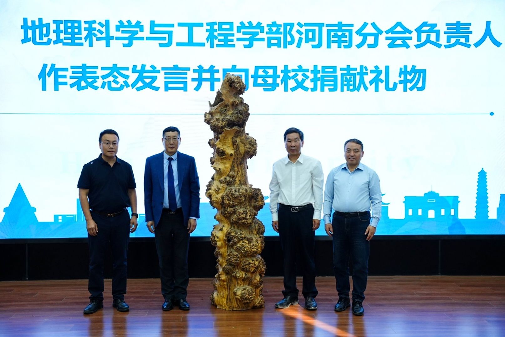 新当选的张占武会长在表态发言中表示,将带领分会做好三项工作:一是成为情感纽带,定期组织活动,延续员工间的深厚情谊;二是搭建事业桥梁,推动员工合作,促进产学研融合,为学部建设和河南发展贡献智慧;三是打造传统窗口,弘扬地理学科精神,助力学科创新和人才培养。发言尾声,张占武代表分会向母校捐赠一棵胡杨树。胡杨树生长环境严酷,生命力顽强,象征着河大地理学科百年坚韧、百折不挠之精神,将陈列于地学楼东英博物馆,用于实践教学,是员工返校“五个一”工程(献一策,做一事,帮一人,讲一课,捐一元)的具体体现,承载着员工对母校的深厚情谊。苗长虹与秦奋代表学部接受捐赠。