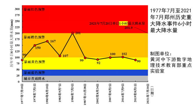 1977年7月至2021年7月郑州历史重大降水事件6小时最大降水量