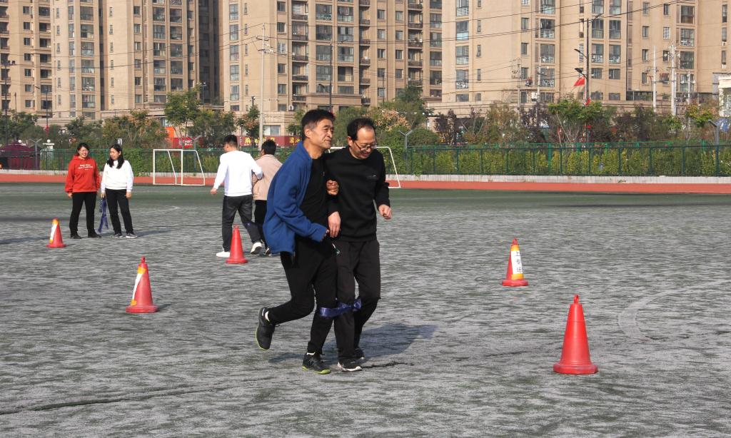 参赛教职工集体绕操场慢跑一周后,比赛正式开始。在带球绕杆接力、齐心协力滚雪球等环节中,教师们你追我赶,赛点不断,快乐不断。走出教室、实验室、办公室的老师们,展现出的是另一种完全不同的风采,他们迈开步子、放开手脚,专心投入到各项比赛中去。
