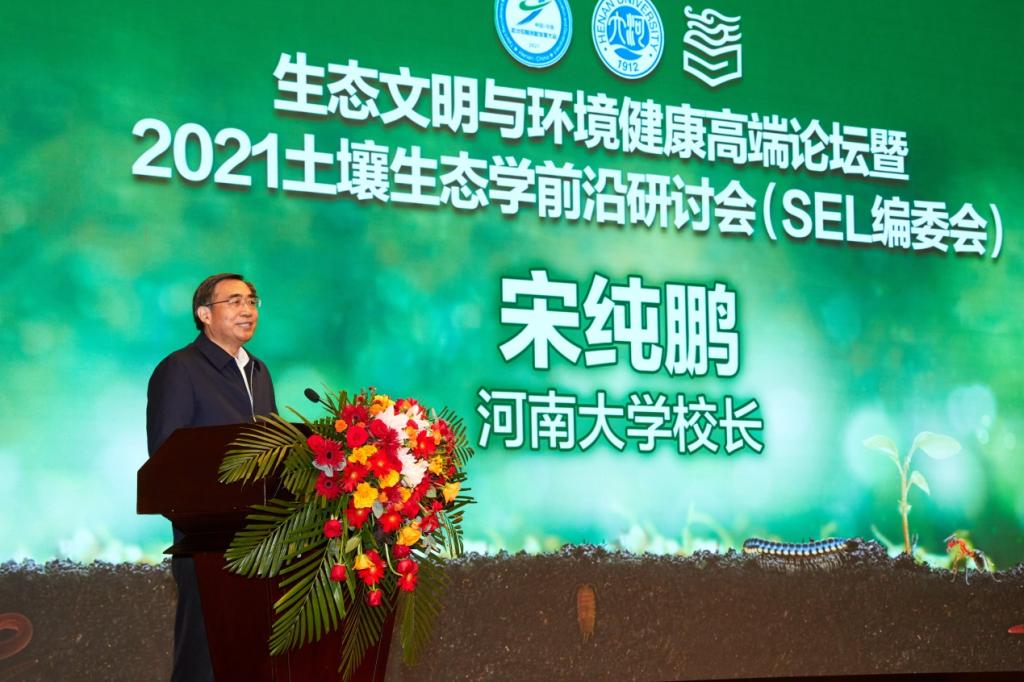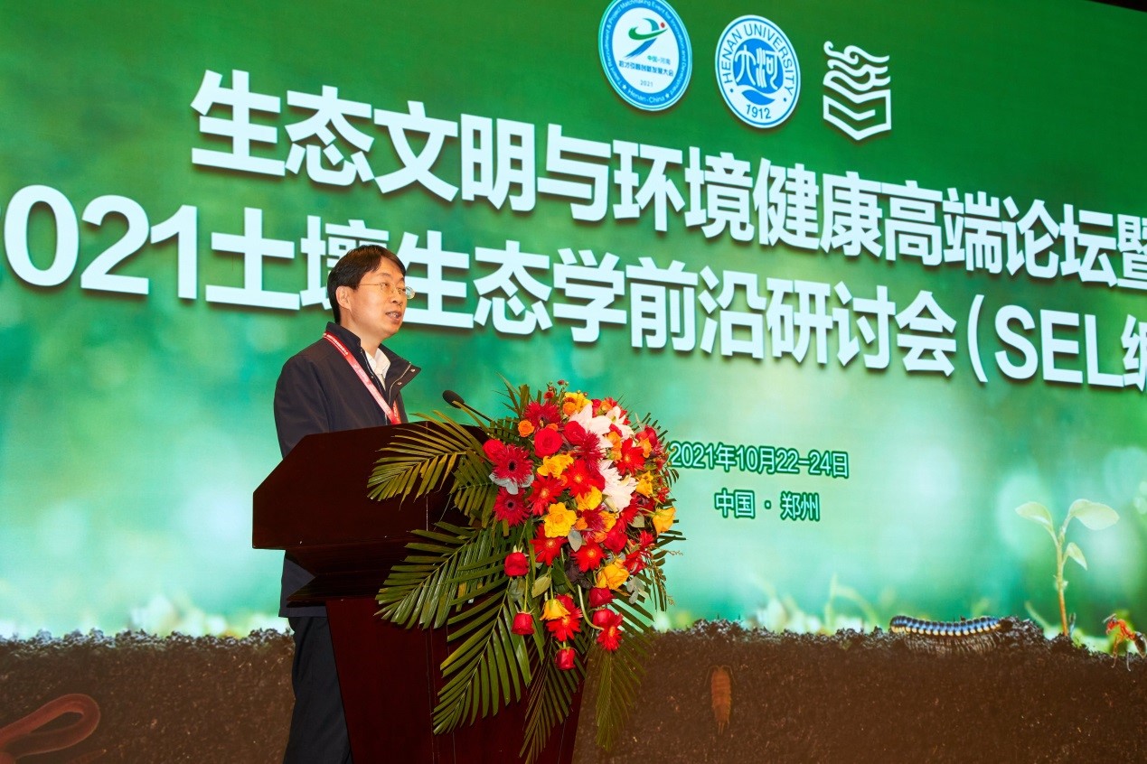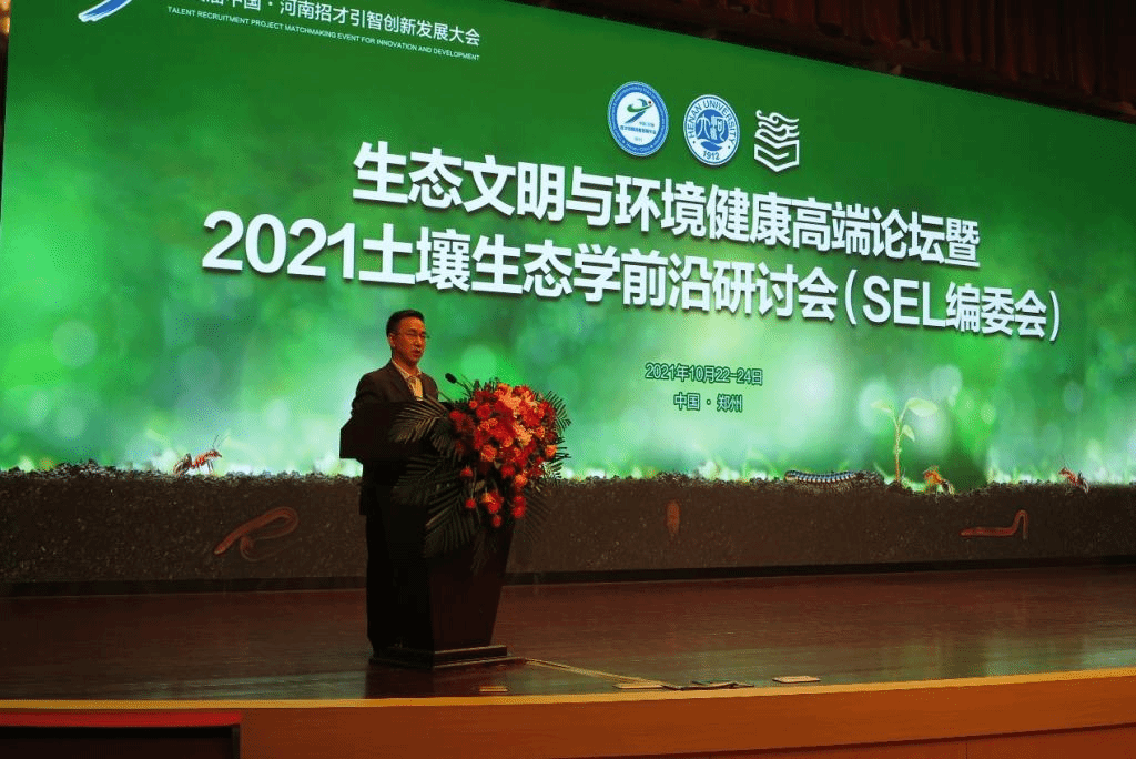 2021年10月23日至24日,“生态文明与环境健康高端论坛暨2021土壤生态学前沿研讨会(SEL编委会)”在郑州国际会展中心大河厅召开。本次研讨会是中国·河南第四届招才引智创新发展大会系列论坛之一,此次会议由565net必赢官方网、高等教育出版社主办,必赢565net官网、Soil Ecology Letters 期刊承办,会议采用“线上线下融合”方式进行。来自全国各地土壤生态学、土壤微生物学、土壤动物学等相关领域的200多位专家、学者线下参会,3000多人线上聆听。本次研讨会以“ 生态文明与环境健康”为主题,围绕近年来土壤生态学领域的前沿和核心问题展开研讨与交流。