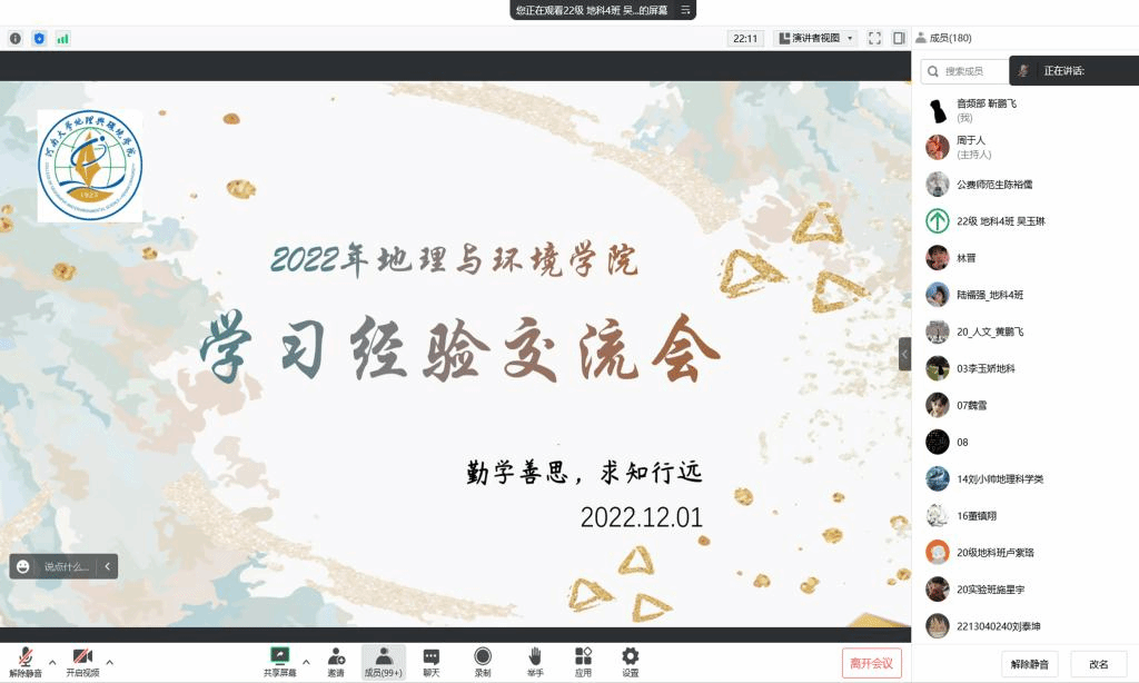 交流会共分为学校概括介绍、优秀学长学姐经验分享、走进大赛、问题解答和互动问答五部分,邀请到2020级地理科学实验班施星宇,2020级地理科学班卢紫珞,2020级地理科学地方公费师范班张兹棪,2020级地理信息科学班全澍,2020级人文地理与城乡规划班黄鹏飞和2020级环境科学班高晨阳六位优秀员工代表。
