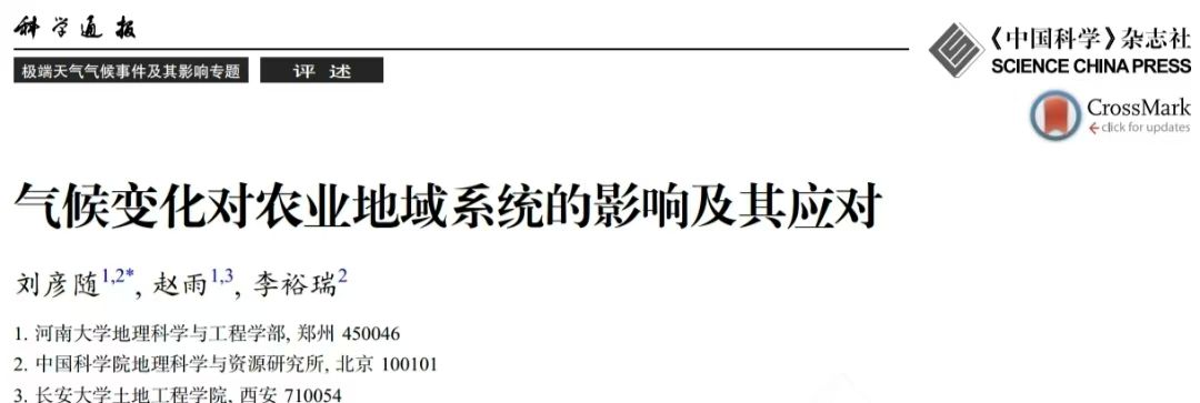 文章链接:刘彦随,赵雨,李裕瑞.气候变化对农业地域系统的影响及其应对[J/OL].科学通报,1-14. https://doi.org/10.1360/TB-2024-1165.