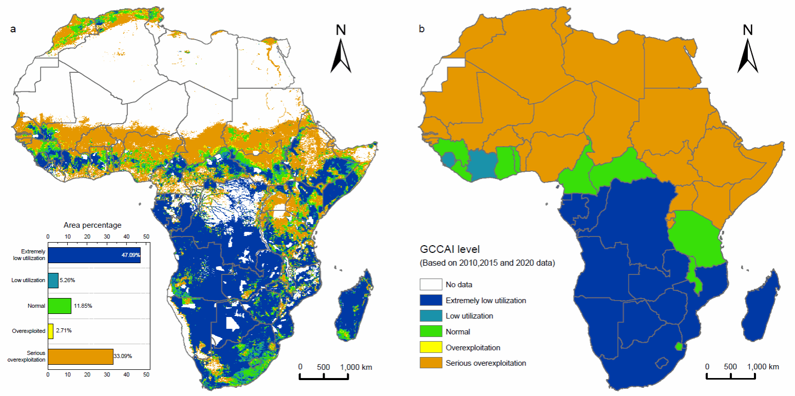 通过GCCAI评估发现,非洲各地区草地资源的利用水平高度不均衡,大约51.02%的草地承受着高压,牲畜数量已超出其承载能力,主要分布在北部非洲;而26.53%的草地则仍未充分利用,主要集中在南部非洲。